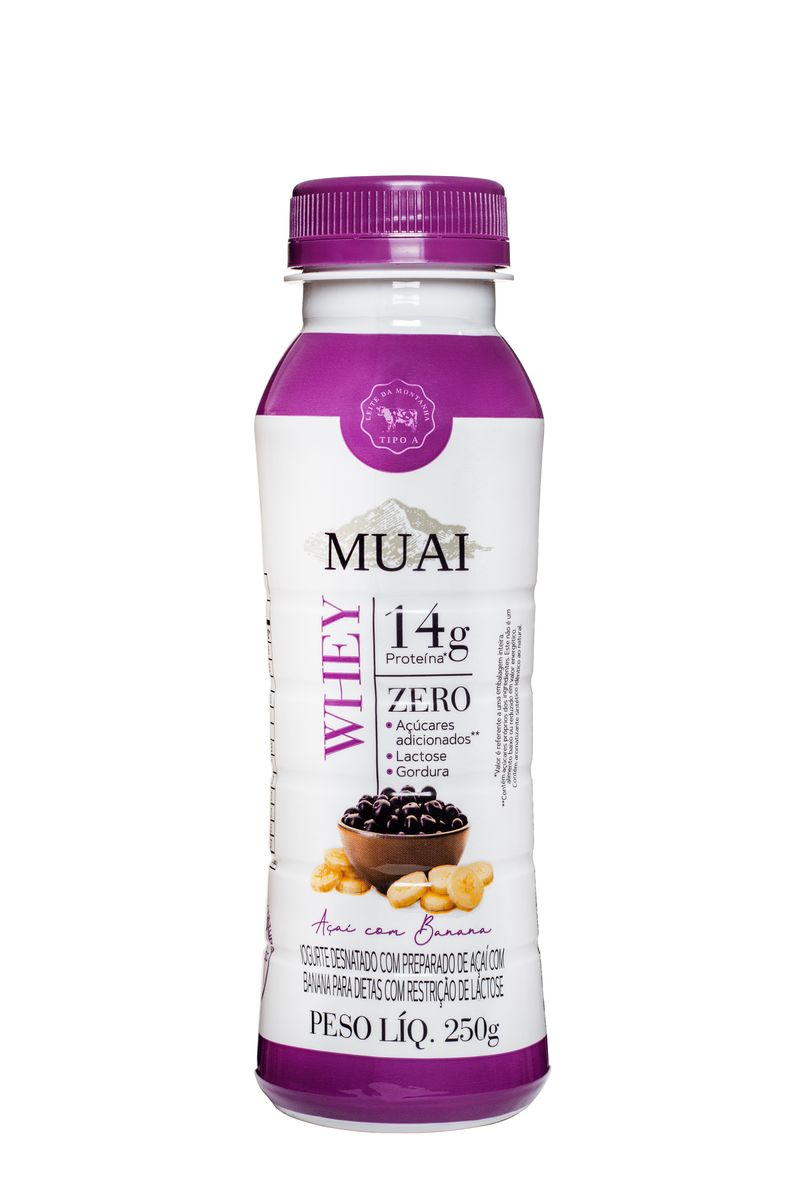 O Whey MUAI é o iogurte proteinado livre de gordura, lactose e açúcar. Apresenta um sabor equilibrado entre o toque levemente ácido do açaí e a doçura natural da banana. Sua textura é cremosa, com aroma lácteo suave e notas intensas das frutas. A viscosidade encorpada na boca é resultado do alto teor de proteínas presente na formulação, que auxilia na recuperação muscular, promove saciedade e é ideal para dietas equilibradas e consumo no pós-treino. Sendo uma opção leve e saudável mesmo para pessoas com restrições alimentares. Por ser um produto fermentado, também contribui para o equilíbrio da flora intestinal, sendo uma alternativa prática, saborosa e nutritiva para o seu dia a dia. Sem receitas, sem combinações, pronto para consumir.