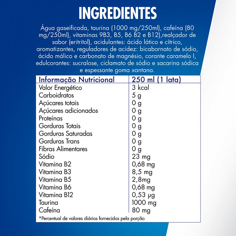 | Ingredientes | Ingredientes*Água gaseificada, taurina (1000mg/250ml), cafeína (80mg/250ml), vitaminas (B3, B5, B6, B2 e B12), realçador de sabor (eritritol), acidificantes: ácido lático e ácido cítrico, aromatizantes, reguladores de acidez: bicarbonato de sódio, ácido málico e carbonato de magnésio, corante caramelo I, edulcorantes: sucralose, ciclamato de sódio e sacarina sódica e espessante goma xanta. Armazenar em local Temperatura Ambiente |