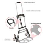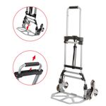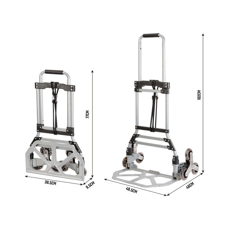 Carrinho Dobrável Workpro. • Três Rodas para Movimentação Suave • Alça de EVA para Pegada Confortável • Hastes Telescópicas para Altura Ajustável • Base de Alumínio Antiderrapante e Resistente • Projetado para transportar mercadorias no chão e também para subir e descer escadas. • Fácil de Guardar AVISO • Não exceda a capacidade de 75kg. • Capacidade de carga de 50kg ao usar em escadas. • Nunca use cordas elásticas danificadas! • Não use essas cordas elásticas como dispositivo de fixação de cargas em veículos! • Não amarre nem dê nós nas cordas elásticas! • Não tente alterar ou dobrar os ganchos de fixação! Medidas: 77 X 38,5 X 9,5 CM.