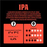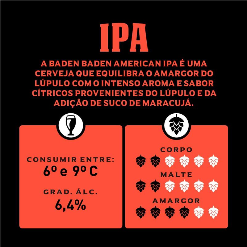 A Baden Baden American IPA 600ml é uma cerveja artesanal que equilibra o amargor do lúpulo com o intenso aroma e sabor cítricos provenientes do lúpulo e da adição de suco de maracujá. A cerveja American IPA harmoniza com pratos cítricos e gordurosos, como carnes vermelhas e queijo cheddar. Se você é um apaixonado por cervejas artesanais, vale conferir também os outros estilos de Baden Baden: Cristal (Pilsen), Witibier (Trigo com notas de coentro e laranja) e Golden (Com notas de Canela e Frutas Vermelhas). A Baden Baden eleva a experiência cervejeira com sabores e combinações surpreendentes. Colocamos dentro de cada garrafa um pouco de tradição junto com inovação. Nós criamos receitas com sabores únicos. Experimente agora!