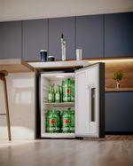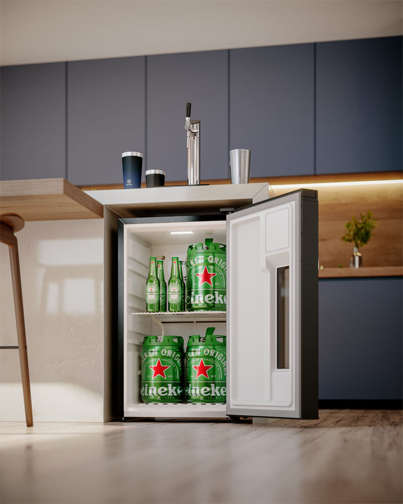 "Funções Cervejeira, Chopeira e Minibar. Controle a temperatura do seu Home Bar de -5ºC a 10ºC, dependendo do que pretende armazenar, seja cerveja ou outras bebidas. A única solução de bar completa na sua casa*.
