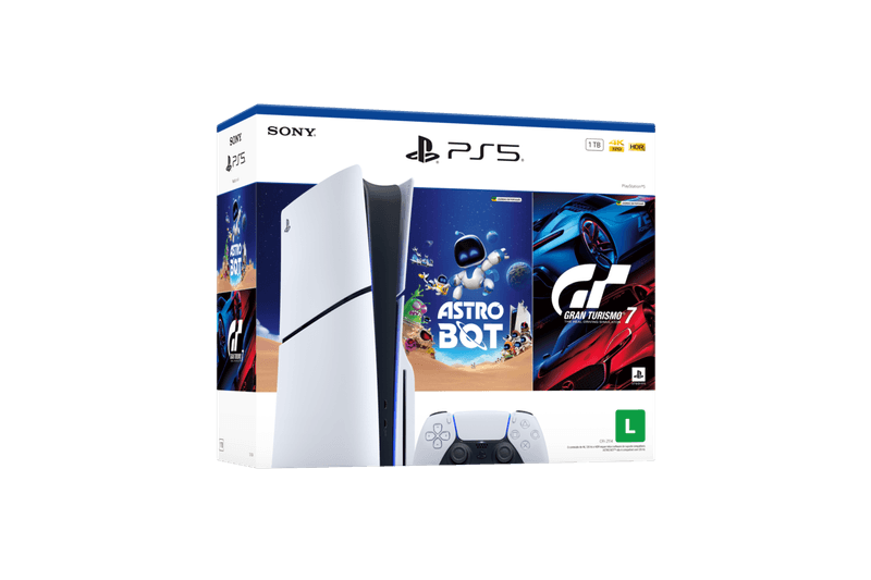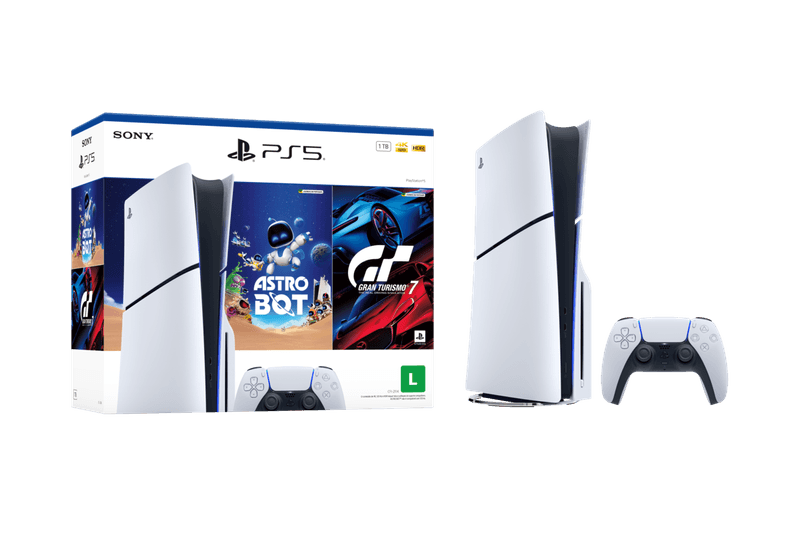 | Conteúdo da Embalagem | Voucher para o jogo completo do Gran Turismo 7* Voucher para o jogo completo do ASTRO BOT* Controle sem fio 1TB SSD, unidade de disco4 2 pés do suporte horizontal Cabo HDMI® cabo de alimentação CA Cabo USB, materiais impressos ASTRO’s PLAYROOM (Jogo pré-instalado) *É necessário ter uma conta na PlayStation Store e conexão à Internet para resgatar o voucher." |
