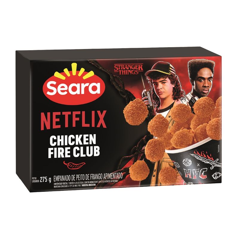 O EMP Chicken Stranger Things 275g é o Chicken Fire Club, um empanado de frango apimentado da Seara, lançado em parceria com a Netflix. A embalagem de 275 gramas é uma edição especial, com o nome inspirado no Hellfire Club, o clube de RPG da série.