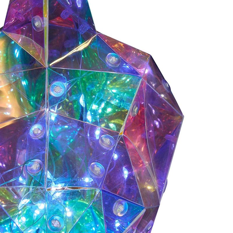 Transforme qualquer ambiente em um espaço moderno e encantador com a Luminária 3D Iridescent VRD. Seu design holográfico em acrílico iridescente cria efeitos visuais fascinantes, refletindo cores que mudam conforme o ângulo de vista.