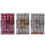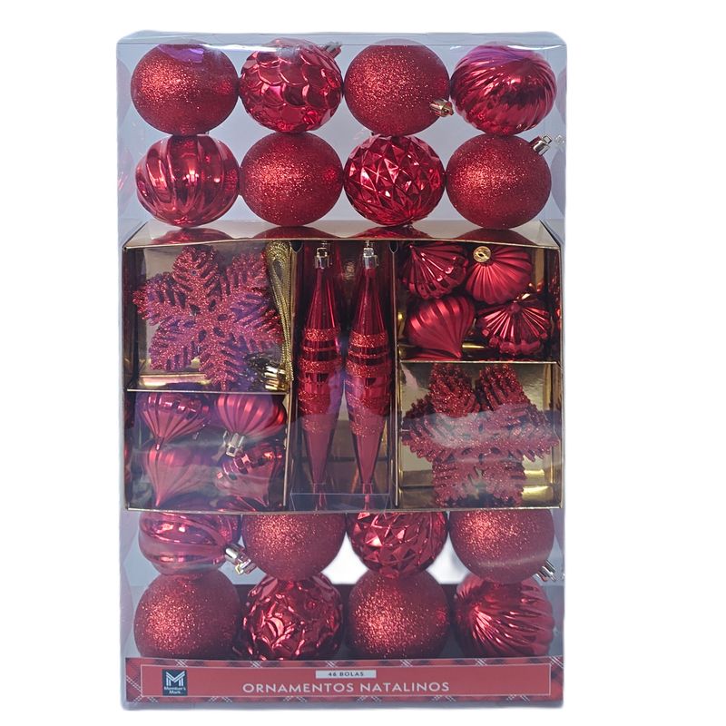 | Quantidade na Embalagem | Quantidade: 46 Unidades 8 cebolas de 50 mm (4 brilhantes, 4 foscos) 16 bolas de 70 mm (8 decorações, 8 lisas) 18 flocos de neve brilhantes de 100 mm 4 remates de 170 mm (2 decorações, 2 lisas) |